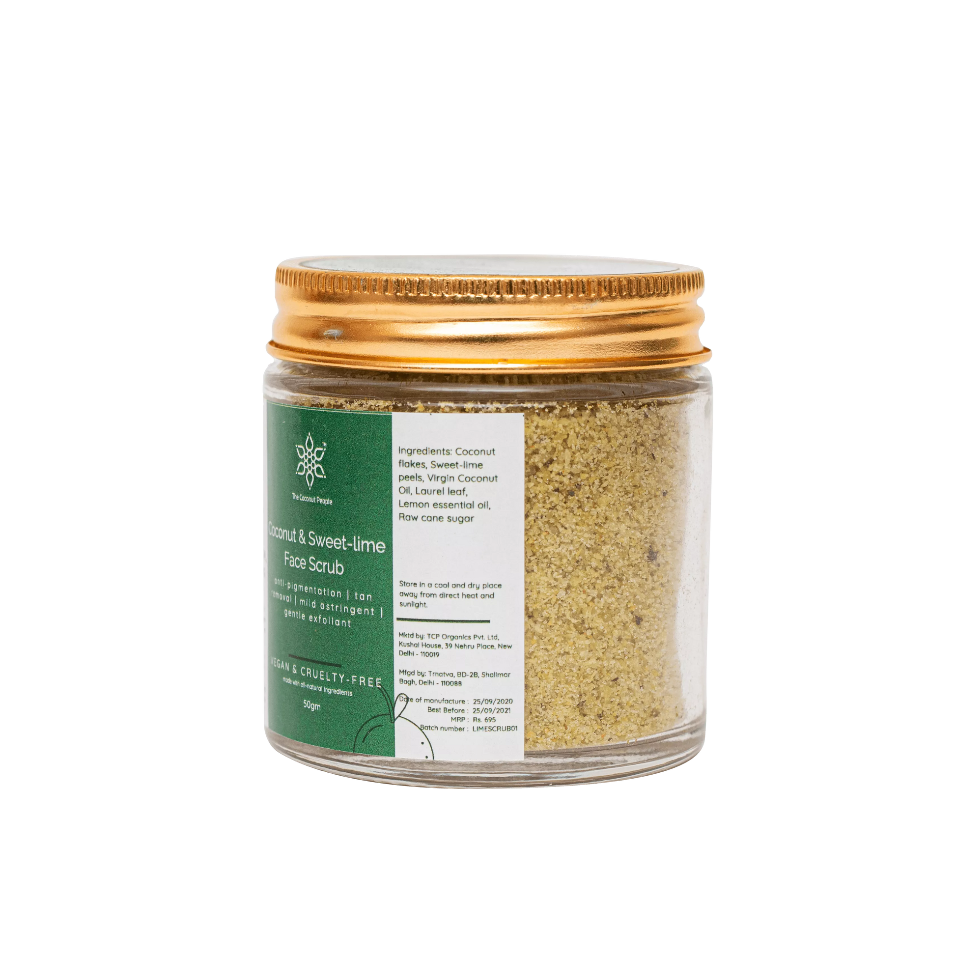 Virgin Coconut Oil: Nourishes and strengthens your skin's natural barrier, preserving moisture for soft, supple skin. Raw Cane Sugar Utilizes AHAs to gently exfoliate and remove dry, dead skin cells, while defending against toxins. Lemon Essential Oil: Packed with antioxidants and Vitamin C, this oil tones skin and helps remove dead cells. All Ingredients: Coconut Flakes, Sweet-lime Peels, Virgin Coconut Oil, Laurel Leaf, Lemon Essential Oil, Raw Cane Sugar